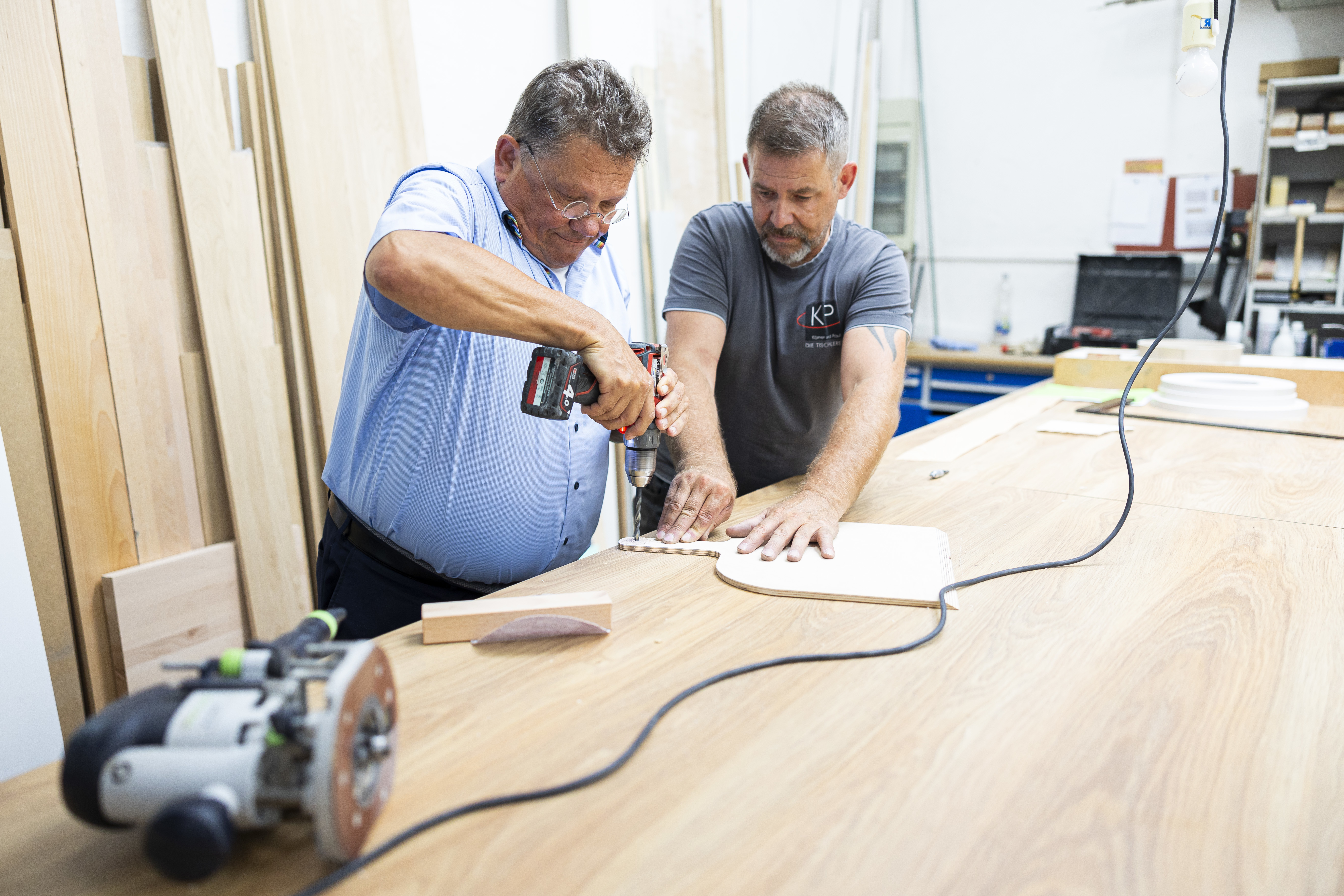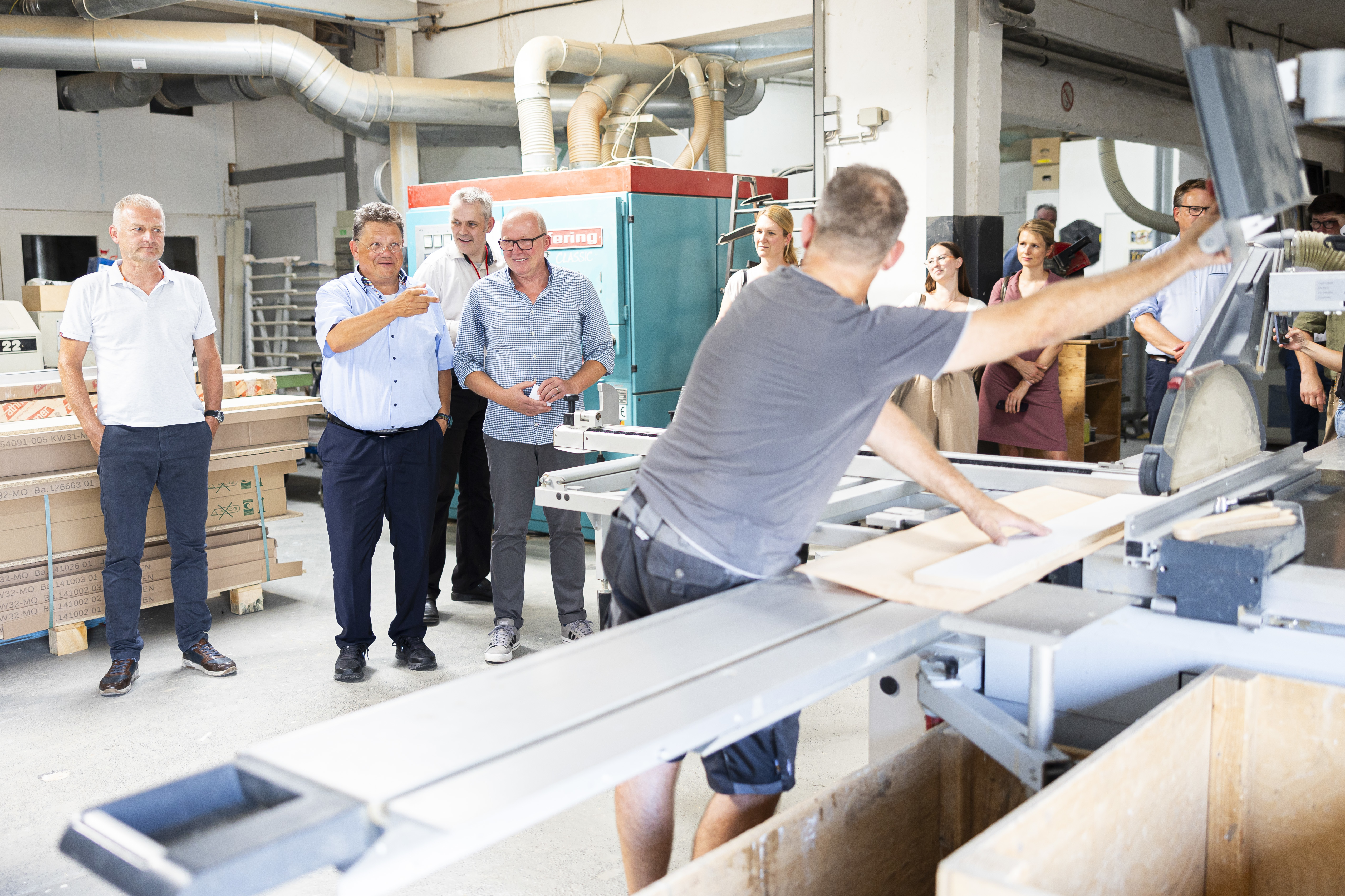 Gemeinsam mit dem Geschäftsführer der Kreishandwerkerschaft Braunschweig-Gifhorn (KH BSGF), Dr. Andreas Bierich, hat Minister Philippi am Nachmittag die Tischlerei Körner und Pauli in Braunschweig besucht. Der Handwerksbetrieb ist Mitglied in der KH BSGF und stellt die Themen „gute Arbeitsbedingungen“, „gute Ausbildung“ und „Integration“ in den Mittelpunkt seiner Unternehmenspraxis.