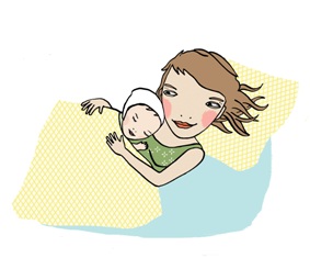 Foto: Frau liegt mit ihrem Kind auf der Brust im Bett.
