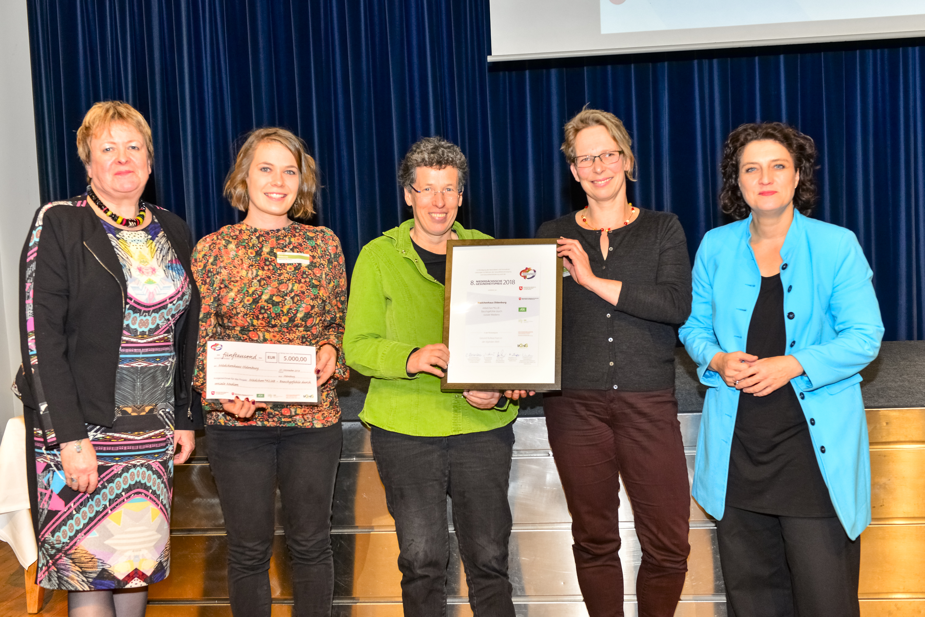 Der Niedersächsische Gesundheitspreis 2018 wurde am 27. November im Alten Rathaus Hannover an drei Initiativen verliehen. Die Preiskategorien knüpfen an den aktuellen Gesundheits- und Unterstützungsbedarf im Land an. Dabei legt der Preis in der Kategorie „Gesund Aufwachsen in der digitalen Welt“ den Fokus auf den Alltag von Kindern und Jugendlichen sowie auf den Einfluss ihrer Erziehungsberechtigten im Umgang mit digitalen Medien wie Smartphones, Tablets & Co.. Magdalene Linz, Präsidentin der Apothekerkammer Niedersachsen und Unterstützerin des Gesundheitspreises, zeigte sich beeindruckt vom Projekt des Mädchenhauses Oldenburg: „Mit dem Preis zeichnen wir Menschen aus, die sich auf besondere Weise hervortun. Der Mädchen*KLUB spricht in regelmäßigen Treffen sensible Themen wie Körperwahrnehmung und Ernährungsverhalten an, die durch die sozialen Medien immer mehr an Bedeutung gewinnen. Pädagogen beantworten in den Gesprächen Fragen und vermitteln wichtige Werte wie Selbstbewusstsein und Wertschätzung. Die Fähigkeit zur Selbstreflexion ist eine der wesentlichen Voraussetzungen dafür, warum junge Mädchen zu starken Frauen heranwachsen. Das Projekt zeigt uns, wie wichtig Wissen und menschliche Beziehungen für eine gesunde Lebensführung sind.“